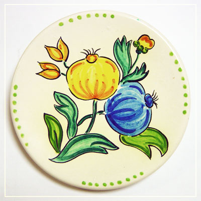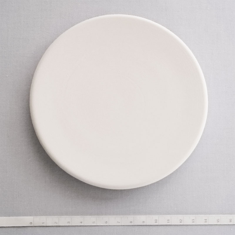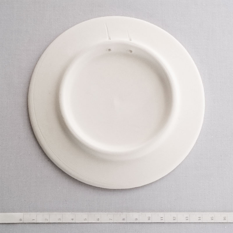 *凹凸がなく絵付けしやすい皿。高台に紐を通して壁に飾るための穴が2つあいています
