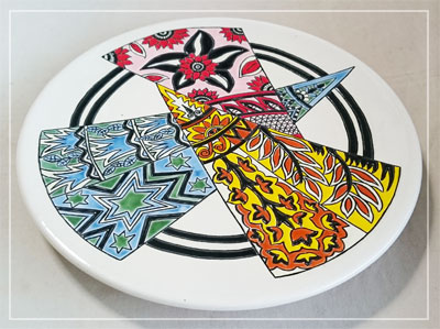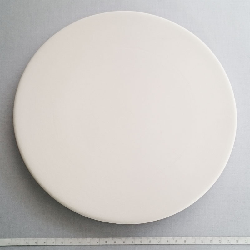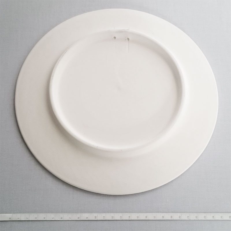 *凹凸がなく絵付けしやすい皿。高台に紐を通して壁に飾るための穴が2つあいています